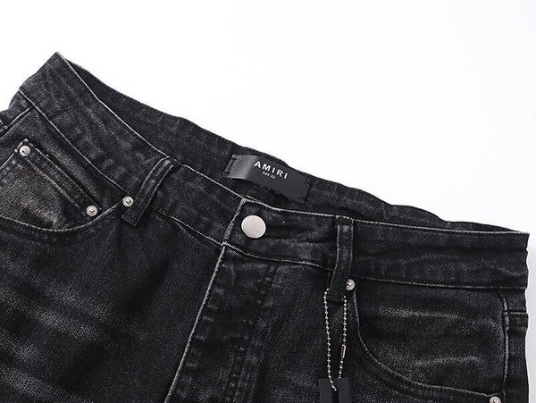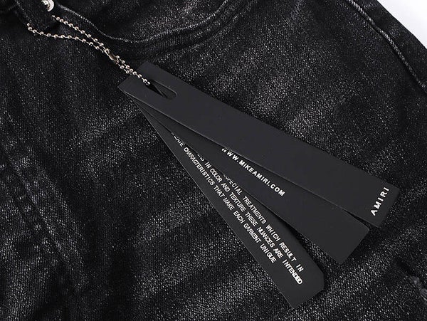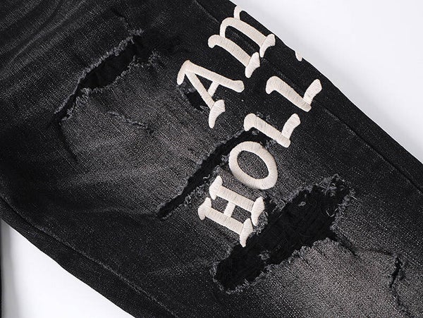 AM348# MR8140 – Zwarte Distressed Jeans met AMIRI HOLLYWOOD Print | Maten 30-38 | Slim Fit Streetwear