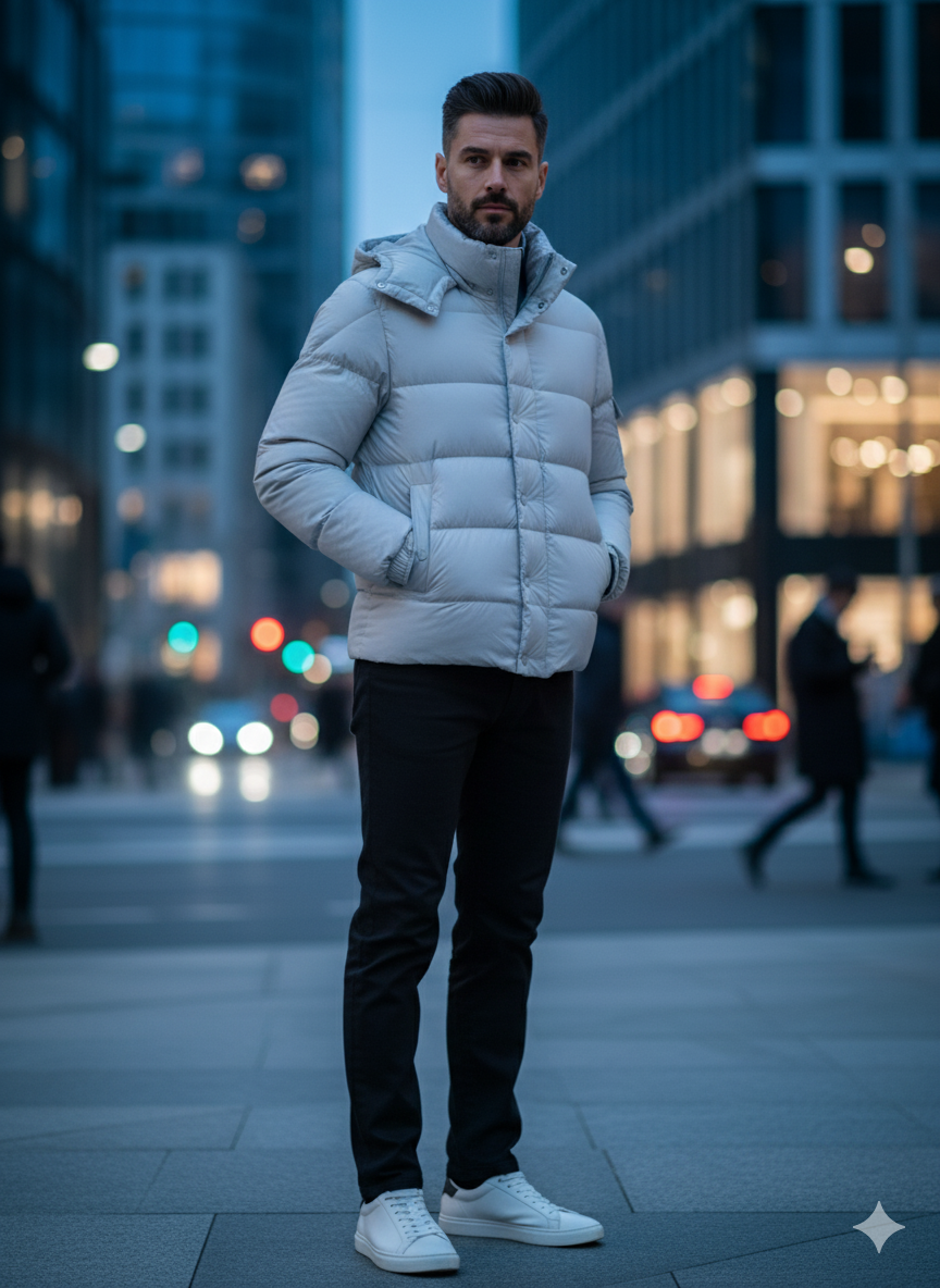 Het ontwerp is clean en heeft een gestandaardiseerd horizontaal quilting patroon. De jas is voorzien van een hoge, beschermende kraag en een praktische, afneembare capuchon die aan de kraag is bevestigd met drukknopen.