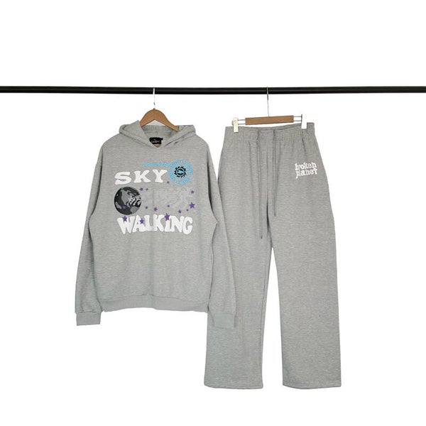Design Themas: De hoodie is voorzien van een groot, opvallend grafisch ontwerp met de tekst "SKY WALKING" en een afbeelding van de aarde/planeet, omringd door sterren. De stijl is typerend voor de oversized streetwear trend.