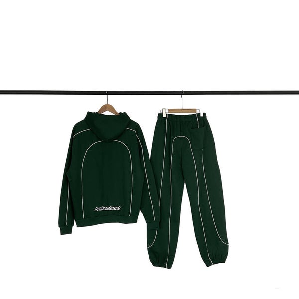 Dit is het Broken Planet Pipeline Trainingspak, een complete set die bestaat uit een hoodie en een joggingbroek in een opvallende streetwear-stijl. Het pak kenmerkt zich door de unieke, dikke contrasterende biezen (piping) die over het gehele kledingstuk lopen.