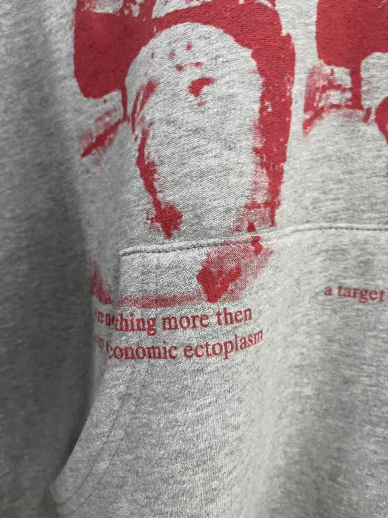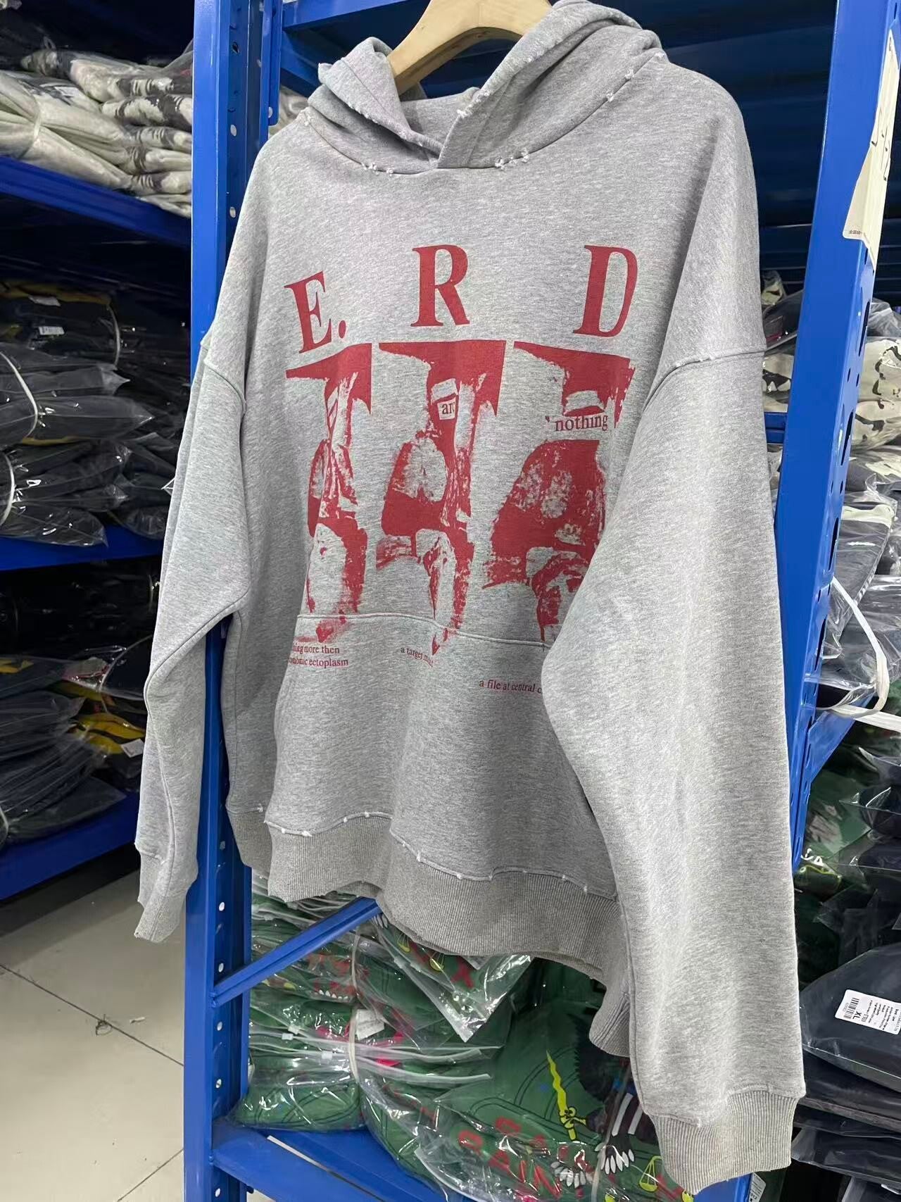Achterkant Grafiek: De achterkant van de hoodie toont een complexe rode grafiek met de afbeelding van een gezicht (mogelijk een profiel) en tekst die in een cirkelvormig patroon is gerangschikt rondom de afbeelding. De tekst bevat woorden zoals "time", "disaster", "rebellion", "a bad trip", "dark side", wat de melancholische en rebellische thema's van ERD onderstreept.