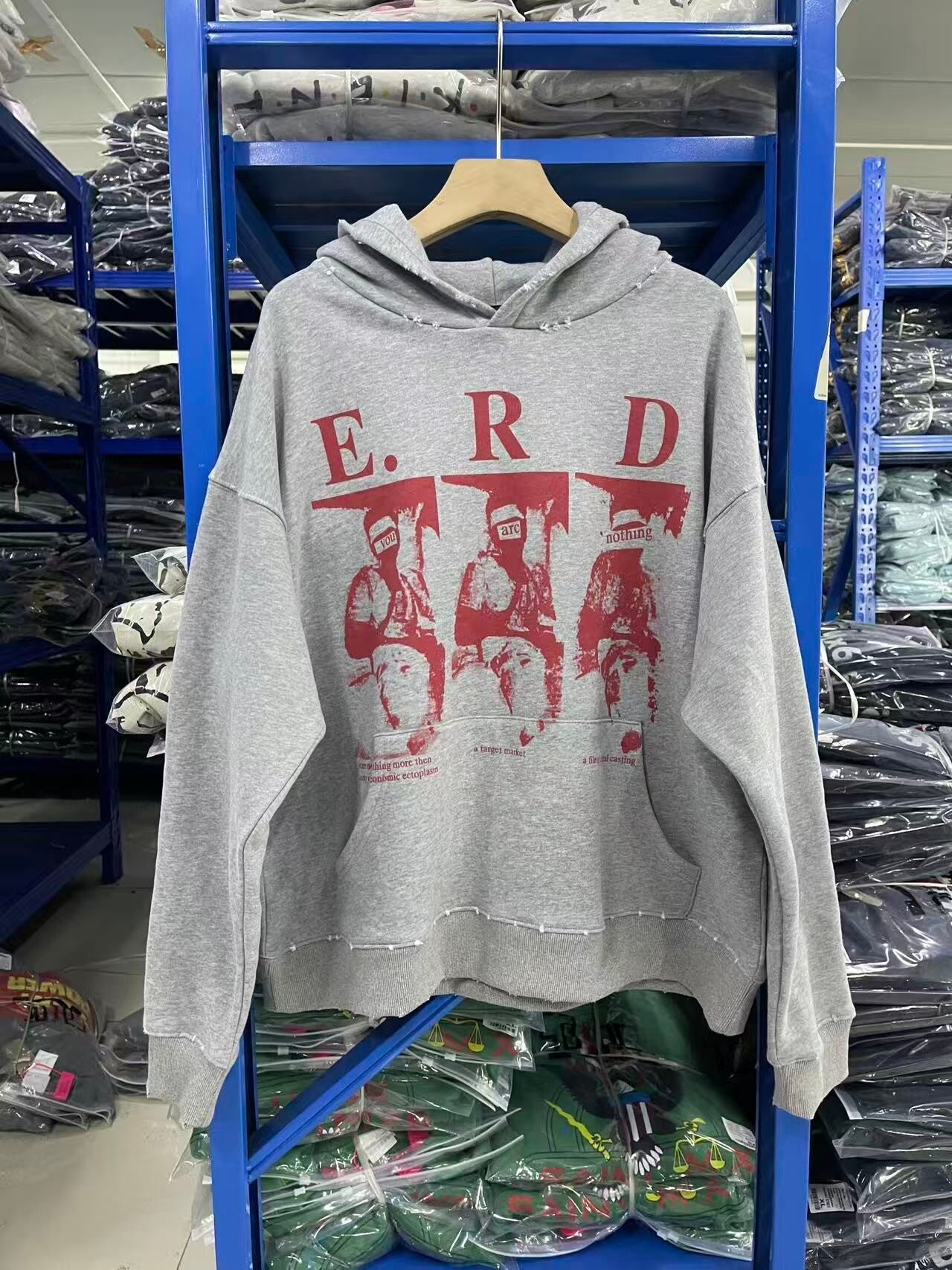 Voorkant Grafiek: Op de voorkant staat de afkorting "E. R. D" in een gotisch of robuust lettertype, met daaronder een afbeelding in rood printwerk van drie figuren die er historisch of ritueel uitzien. Deze afbeeldingen zijn vaak artistiek en intrigerend, passend bij de 'depressed rich kids' vibe van het merk.