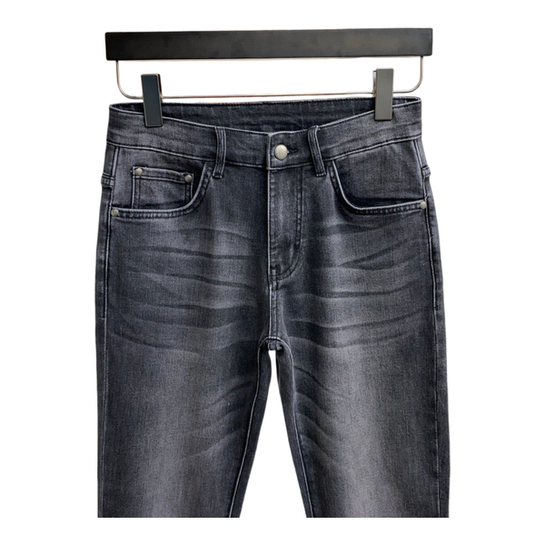 Bottega Veneta staat bekend om zijn subtiele luxe en vakmanschap, en deze jeans past perfect binnen die esthetiek. De donkere wassing en lichte fading op de dijen en knieën geven het een gedragen maar verfijnde uitstraling. De afwezigheid van opvallende logo’s benadrukt het minimalistische karakter van het merk.