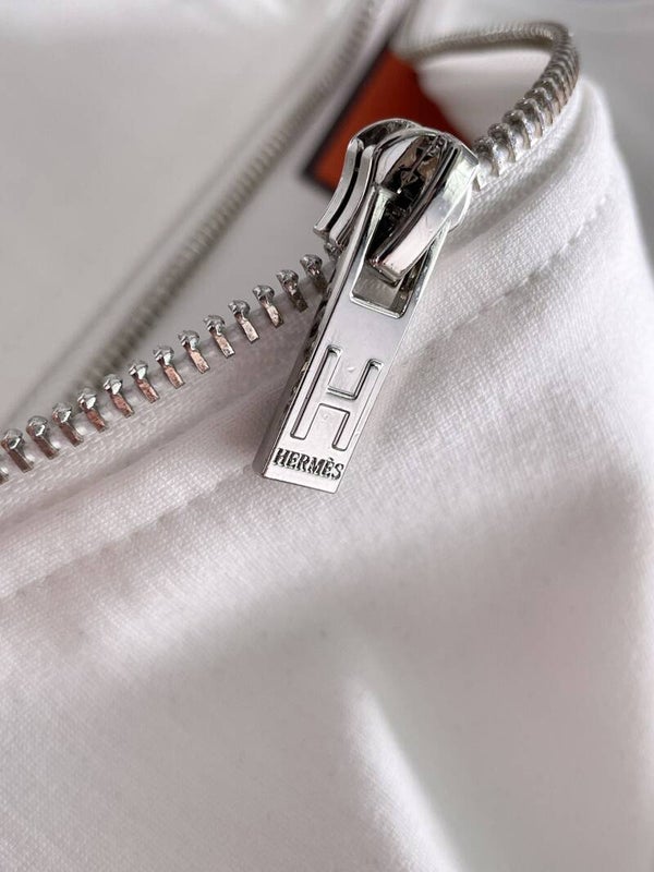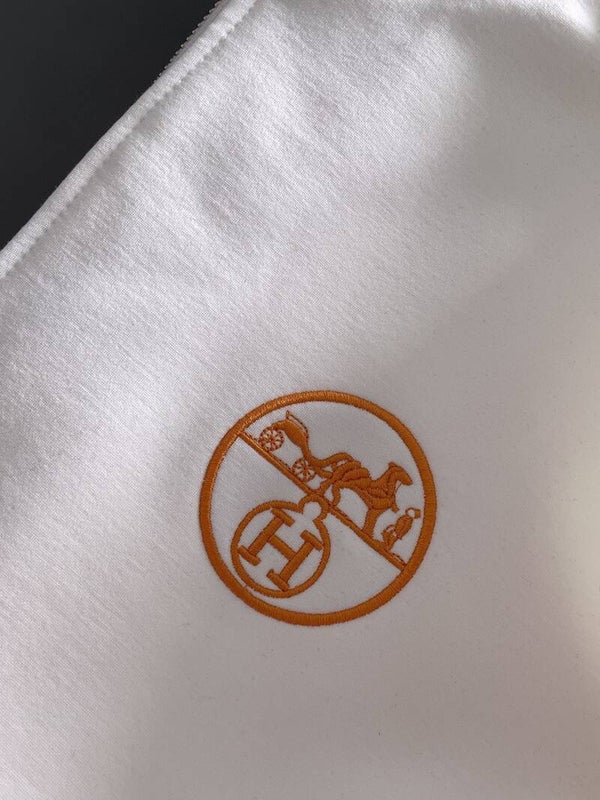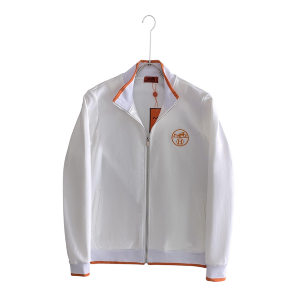 De nieuwe Hermès set met referentie WK00 is een luxe tracksuit beschikbaar in maten M t/m XXXL, uitgevoerd in wit of zwart met opvallende oranje accenten en een geborduurd logo.