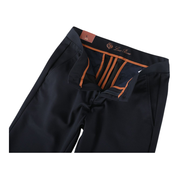 De kleurselectie – zwart, marine en grijs – biedt veelzijdigheid en laat zich makkelijk combineren met overhemden, truien of blazers uit Loro Piana’s collectie. Dankzij de stretchcomponent in de stof beweegt de broek soepel mee, ideaal voor lange dagen of reizen.