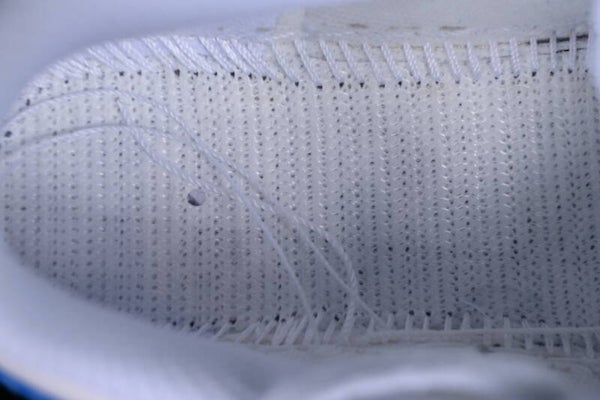 Kleurstelling: Wit/Blauw. De schoen heeft een witte leren basis met fel blauw leer op de overlays, de vetersluiting, de hiel, de voering en de rubberen buitenzool.