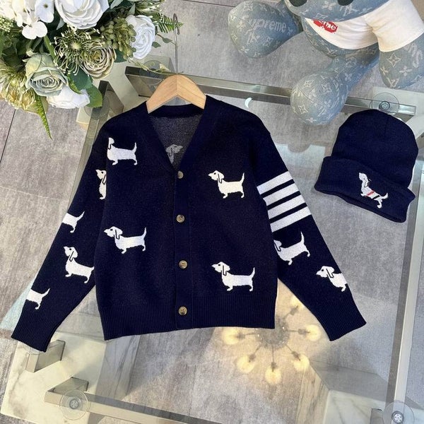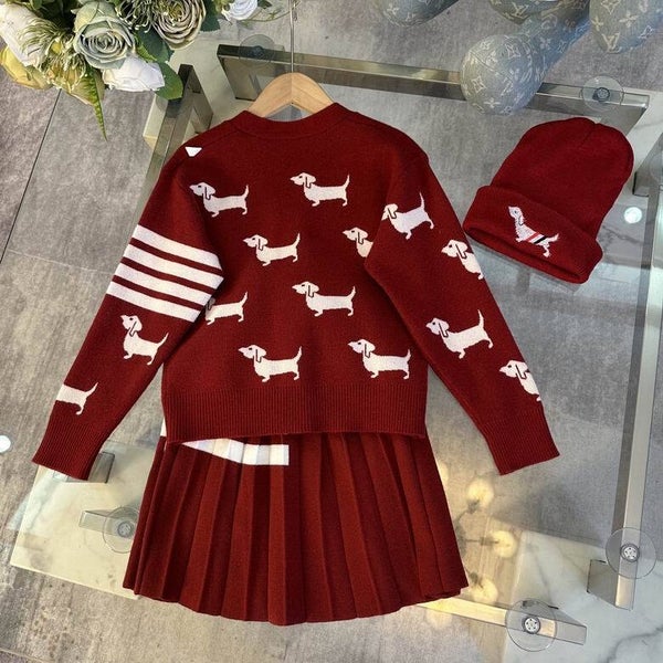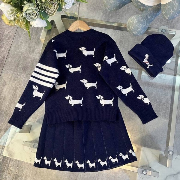 Thom Browne Kinderoutfit Set – Cardigan, Rok & Beanie met Teckelmotief – Maat 110–160