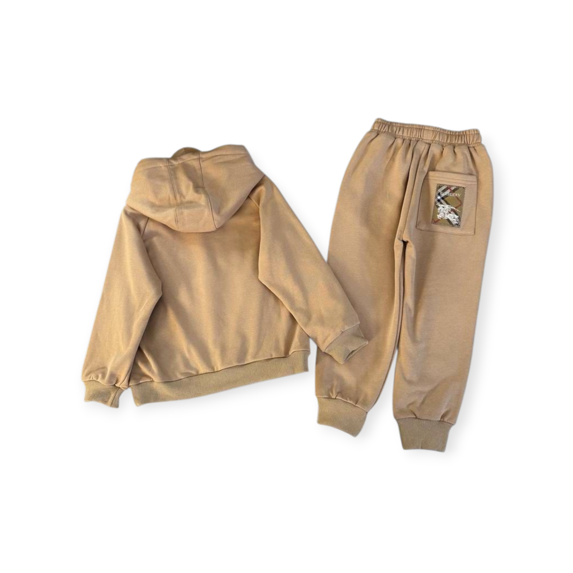 Geef je kind een stijlvolle en luxueuze uitstraling met deze Burberry tweedelige set, ontworpen voor kinderen in de maten 110–160. De set bestaat uit een beige hoodie en bijpassende joggingbroek, beide voorzien van Burberry’s iconische ruitmotief en het geborduurde BURBERRY-logo op de borst. De hoodie heeft een handige buidelzak met een patch en comfortabele capuchon, terwijl de broek is afgewerkt met elastische boorden en zijpanelen in ruitprint.