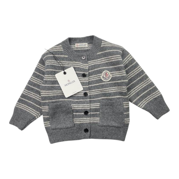 Deze Moncler kinderset straalt sportieve elegantie uit en is perfect voor jonge trendsetters. De set bestaat uit een grijs-wit gestreept vest met zwarte knopen, voorzakken en het herkenbare Moncler-logo op de borst, gecombineerd met een grijze cargobroek met elastische tailleband, manchetten en logopatch op de zijzak.