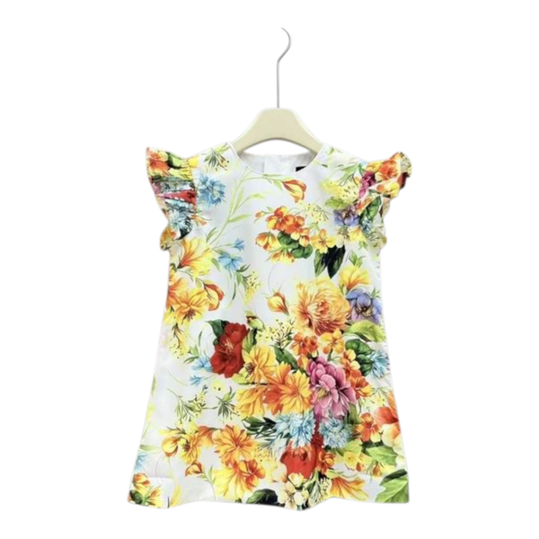 Laat je kind stralen in deze vrolijke en elegante Dolce & Gabbana geïnspireerde bloemenjurk in maten 100–150. De jurk heeft een witte basis met een kleurrijke bloemenprint in rood, roze, geel, blauw en groen. De geplooide A-lijn snit en geruffelde mouwtjes geven het geheel een speelse en zomerse uitstraling. Perfect voor zonnige dagen, feestjes of een stijlvolle wandeling in het park.