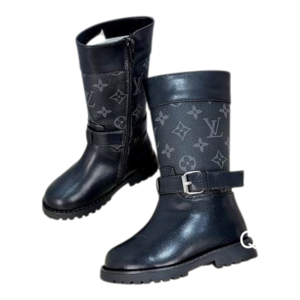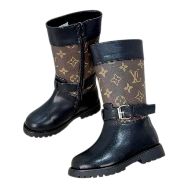 Geef je kind een stijlvolle en robuuste uitstraling met de Louis Vuitton CX0803 kinderschoenen. Deze mid-calf boots combineren zwart leer met het iconische LV-monogram canvas op de schacht, wat zorgt voor een opvallende en luxueuze look. De decoratieve gesp en stevige zool maken deze schoenen niet alleen modieus, maar ook functioneel voor dagelijks gebruik.