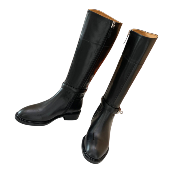 Deze Hermès kniehoge laarzen combineren verfijnde elegantie met subtiele kracht. Verkrijgbaar in zwart suède, camel suède en glad zwart leer, elk paar is voorzien van een decoratieve gesp rond de enkel en een praktische ritssluiting aan de zijkant. De perfecte balans tussen luxe en draagbaarheid – ideaal voor stijlvolle herfst- en winterlooks.